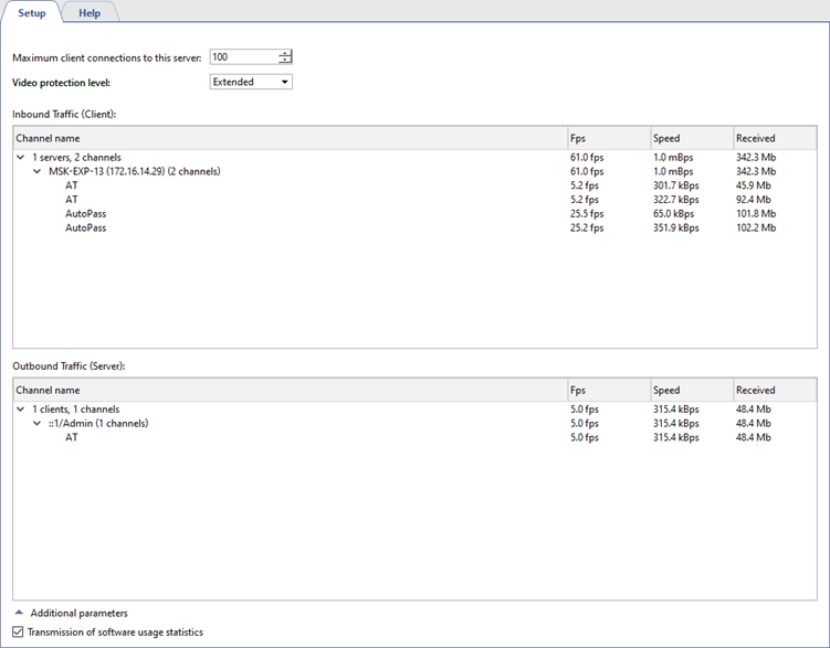 Please note that in order to save the network bandwidth, the server steams video only from those devices where the client-based action is currently taking place (watching video in real time, working with archive data, recording network channels.) Moreover, the setup of the Maximum client connections to this server parameter allows limiting the number of clients that will be able to connect to the given server.