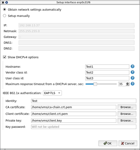 In addition, you can enable IEEE 802.1x authentication to increase the security of the network connection. To do this, select EAP-TLS and specify the appropriate settings, including the certificates required to authenticate the server connecting to the network.