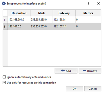 To make the network interface use only the entered routing settings, set the Ignore automatically obtained routes flag.