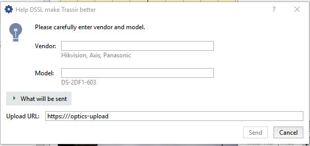 If you want to help the development of our software, you can send the resulting calibration to us. To do this, click the "Send optics model" button. A dialog box in which you can specify the manufacturer of the camera, its model, and see exactly what information will be sent, will open. Leave the "What will be sent" field default. Click the "Send" button to transfer the information.
