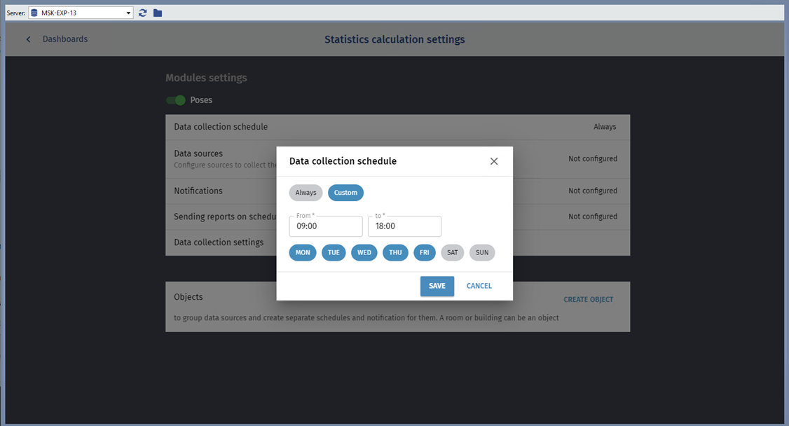To analyze statistics, use the Sending reports on schedule option. This setting allows you to automatically generate and send reports on the pose detector's operation at specified times.