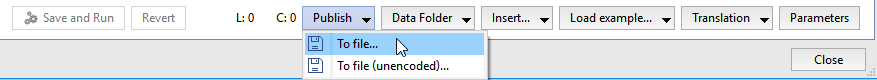 To save the script to a file, click the Publish button and select the desired option: in encrypted form - To file... or as is To file (unencoded)....