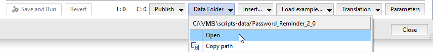 If you need to save data to a folder on the hard drive while a script is running, click the Data Folder button and select Create to create a folder. To open an existing folder, select Open. If you need to insert the path to the folder in the script, then click Copy path to copy it to the clipboard.