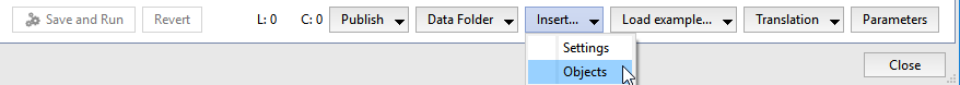 If you click Insert... and select Settings, then in the window that opens you can select the setting you want to insert into the script. To insert a method into the script, select Objects.