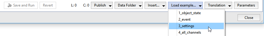 To load a previously saved script or an example script, click the Load example... and select From file... or the name of the example.