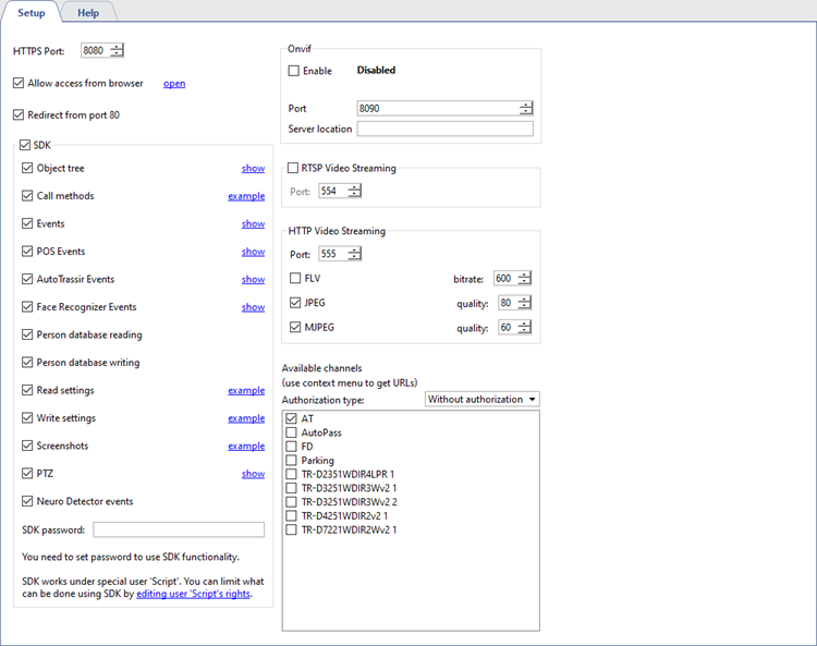 Depending on the functionality you are going to use, you should set the corresponding flags: Object Tree, Call Methods, Events, POS Events, AutoTRASSIR Events, Read Settings, Screenshots, PTZ, etc. You can use the item links for quick performance check of one or another feature, as well as a hint to the command syntax. If you wish to get video from the server or play the archive, check the following flags: FLV, JPEG, MJPEG.