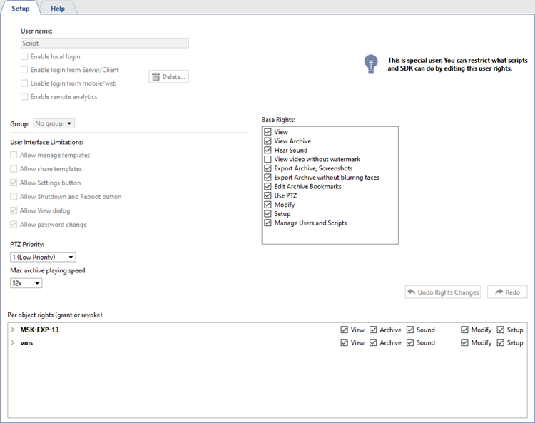 The user account for working with the SDK must have rights to use the required functions. When working by specifying the SDK password, you must configure the necessary rights for the Script service user.
