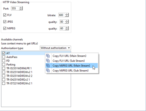 To enable the HTTP Video Streaming function, check the box next to the stream format: MJPEG or FLV, which will be used to transmit the video stream, and set the streaming quality. Below in the list, select the desired channels by checking the boxes next to them, and then copy the stream link from the context menu.