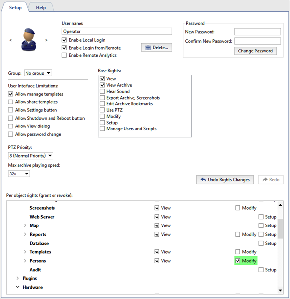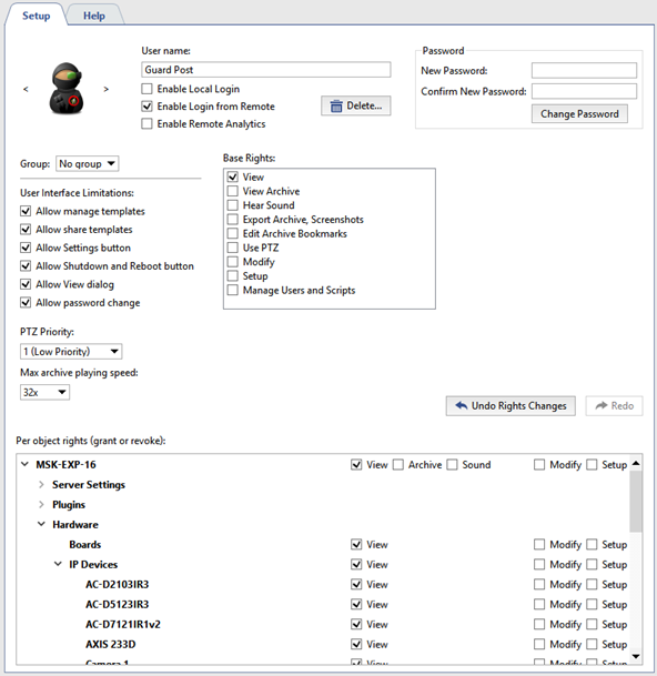 - The Base rights allow View and View archive. Thus, this user can view a live video and work with an archive (only in view mode). Note that given these settings the operator will be able to see the picture but not hear audio.