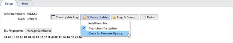 The Software Update function is used to update the server firmware and IP device drivers. To check for an update, select Check for Firmware Update.... If the required update is found, a list of changes will open and you will be prompted to download it.